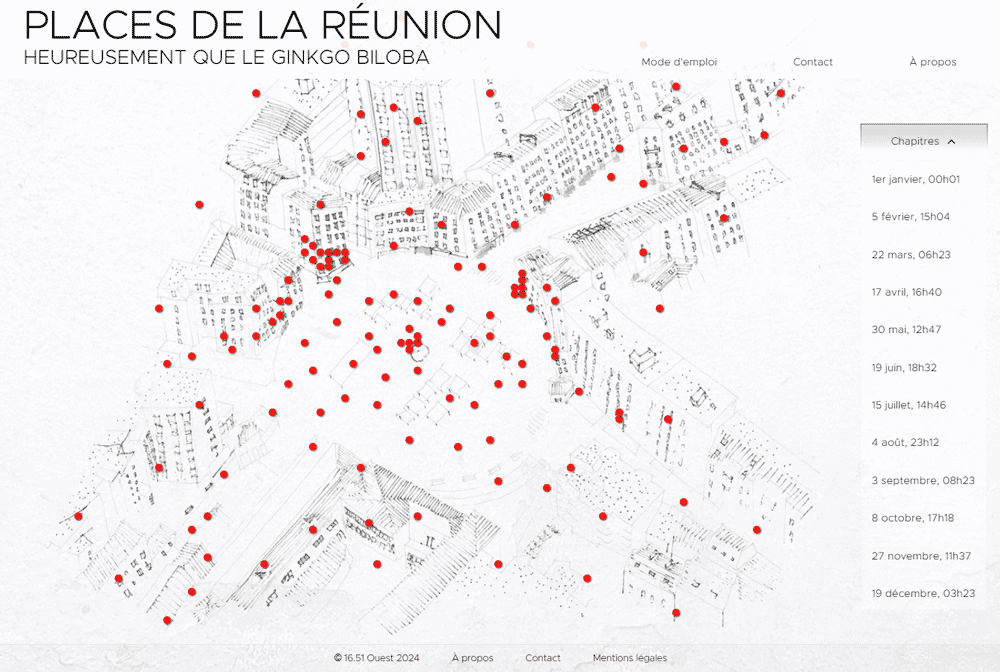 Place de la Réunion, Paris 20e : quelques échos d’un lieu à travers le temps. Ces écritures fragmentaires ont permis d’expérimenter une double forme : une mise en scène graphique et interactive conçue par le développeur web Olivier Prêtre (pour vous y promener, cliquez ici ou sur le dessin), ou une version plus linéaire disponible en PDF.